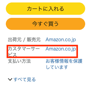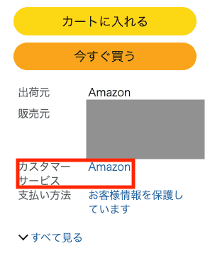 あとは次の画像のように、カスタマーサービスがAmazonであるか否かもしっかりと確認しておきたいところです。何かトラブルがあった場合、24時間電話やチャットで対応してもらえますので。