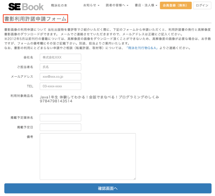 表紙の画像(書影)のご利用については次のように「書影利用許諾申請フォーム」が設けられています。