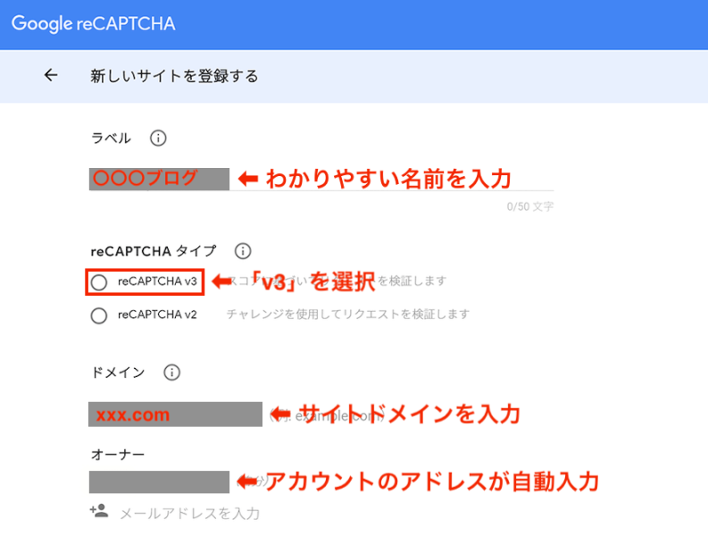 - reCAPTCHA v3 に新規登録して キー を取得