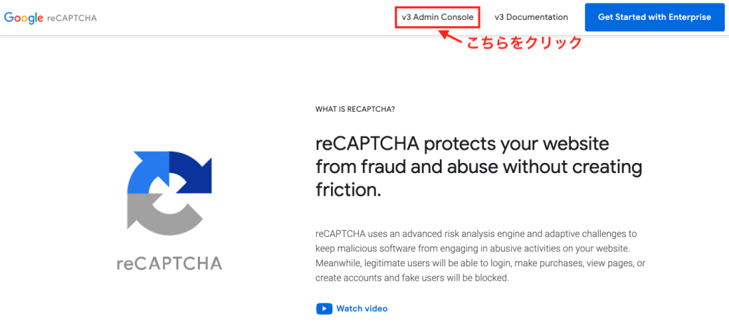 ① Google reCAPTCHA v3 にアクセスして「v3 Admin Console」をクリックする