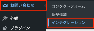 ① WordPressの管理画面から、「お問い合わせ」→ 「インテグレーション」 を選択
