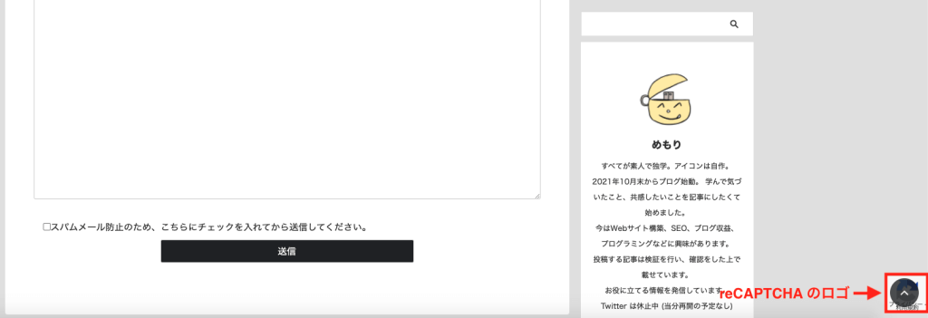 先のように reCAPTCHA を実装するとサイト画面の右下にロゴマーク(バッジ)が表示されるようになります。PCのブラウザ表示で「TOPへ戻る」ボタンの設定をしている場合、ロゴの表示位置と完全に被ってしまいます。
