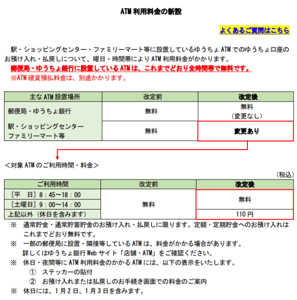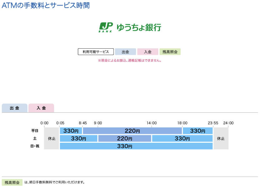 - ゆうちょ店舗内ATMは営業時間帯につき、無料(ただし、ATM硬貨預払料金は、別途かかる)