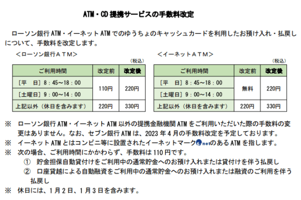 2022年1月17日からゆうちょ銀行の「一部商品・サービスの料金新設・改定」に伴い、次のように改定されました。