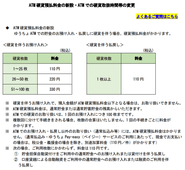 - 郵便局店舗内でのATMに対して、硬貨を伴う預け入れ・払い戻しに料金が発生する