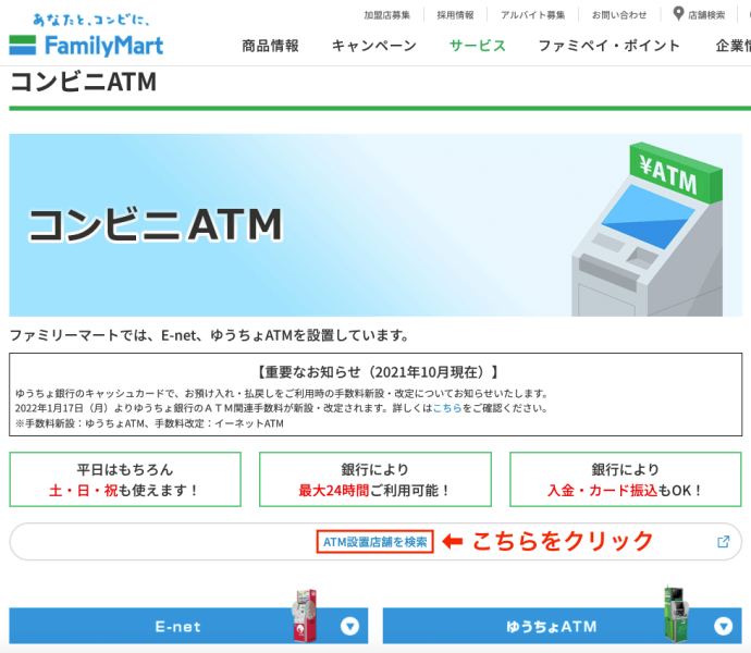 1ファミリーマートの公式HPから「ATM設置店舗を検索」をクリック