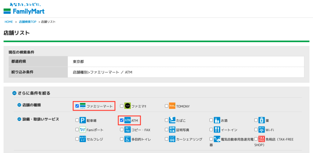 ATMの公式HPでは正確に「ファミリーマート」を指定して検索することができないため