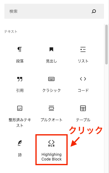 ✔︎ Step1: 投稿画面でブロックを追加する際、「Higllighting Code Block」をクリック