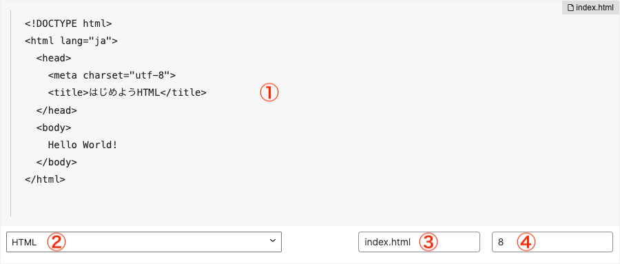 - ファイル名: 「〇〇.html」などファイル名を表示可能 (入力しなければ、選択した言語名が表示されます)
