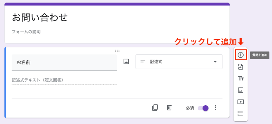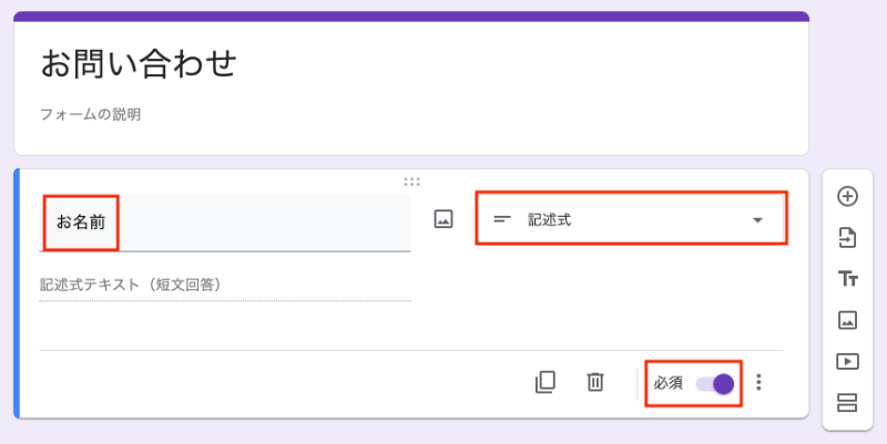 題名を「お名前」、種類を「記述式」に変更して「必須」にカーソル移動する