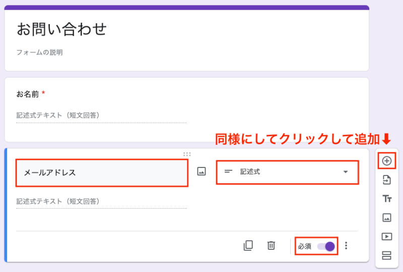 続いて、「質問を追加」をクリックしてお問い合わせに必要な下記の項目を追加していきます。