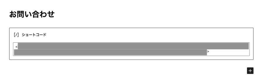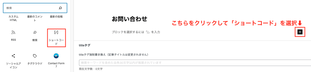 タイトルに「お問い合わせ」を入力して、ブロックエディタから「ショートコード」を選択