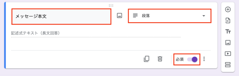 題名を「メッセージ本文」、種類を「段落」に変更して「必須」にカーソル移動する。