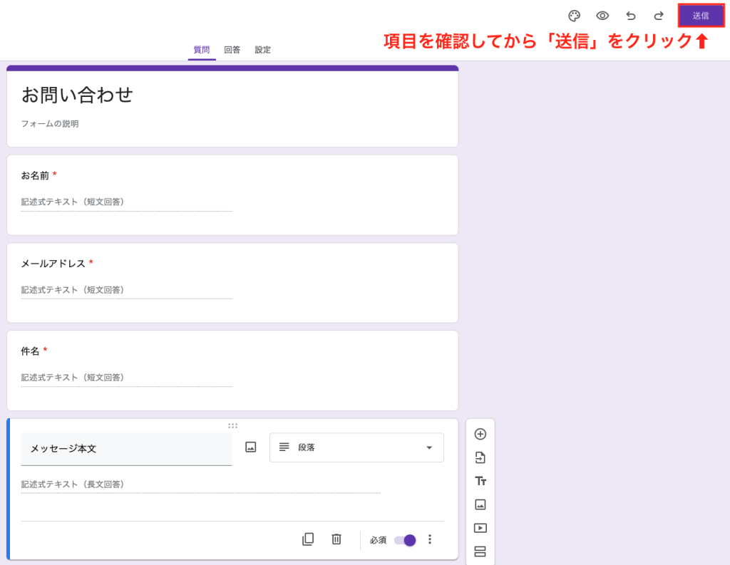 以上で、Google フォームによるお問い合わせメール作成の作業が完了しました。