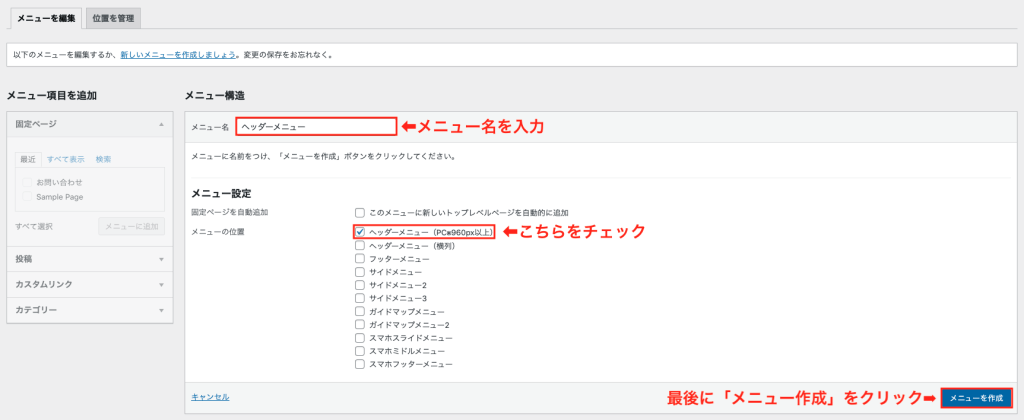 ※メニュー名は「ヘッダーメニュー」でなくても構いません。自身で整理のつく名前にすると良いでしょう。