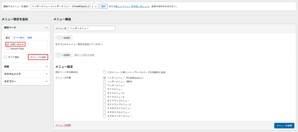 メニュー構造に「お問い合わせ」が追加されたら、メニュー設定の位置を「ヘッダーメニュー」であることに再度確認 → 「メニューを保存」をクリック