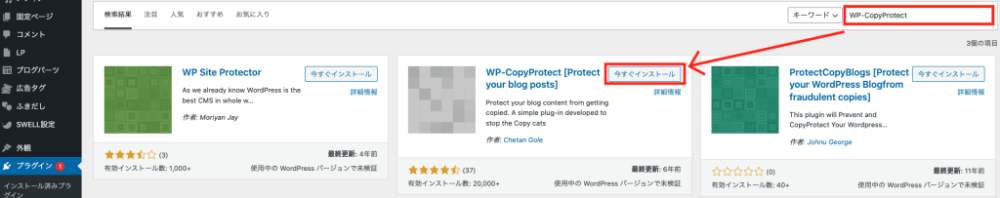 「ダッシュボード画面」→ 「プラグイン」→ 「新規追加」→ キーワードに「WP-CopyProtect」と入力